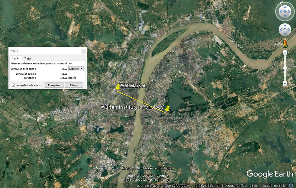Carte montrant le laboratoire de virologie de Wuhan, situé à seulement douze kilomètres du lieu longtemps supposé comme étant l'origine du coronavirus en Chine, le "marché humide" de la ville. Cette proximité fait naturellement naître des suspicions, même si le Hubei est traditionnellement une source de maladies redoutables - comme la Peste Noire - et que c'est vraisemblablement cette spécificité historique et biologique qui a dicté l'implantation du laboratoire le plus avancé de Chine dans la capitale de cette province.