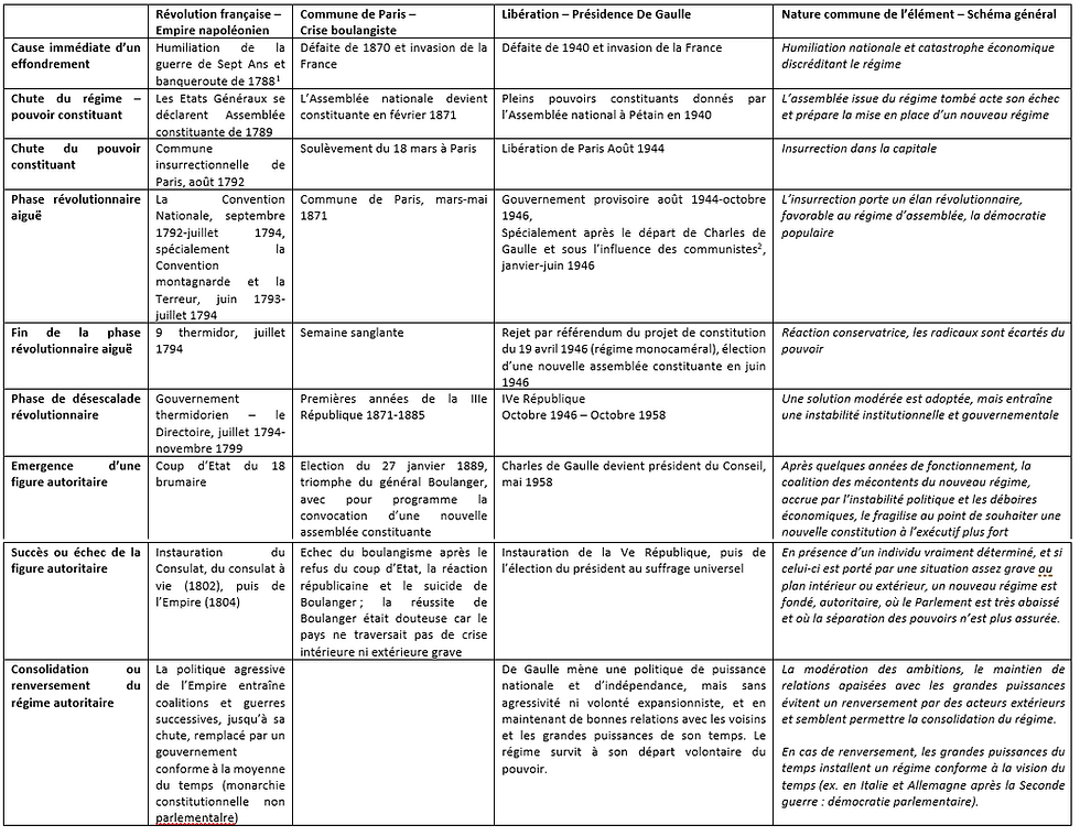 Voici comment j'ai procédé : j'ai repris tous les cas français de révolutions-impérialistes revanchards identifiés, à savoir la Révolution et l'Empire napoléonien ; la fin du Second Empire, la Commune, l'émergence de la IIIe et la crise boulangiste ; l'effondrement de 1940, Vichy, la IVe, Charles de Gaulle, en essayant d'identifier les grandes étapes communes et d'isoler la variable ayant provoqué des divergences entre les différents cas (l'avortement du boulangisme par opposition à la prise de pouvoir effective de Napoléon et de Charles de Gaulle, la chute de l'Empire par opposition à la survivance de la Ve République à son fondateur).