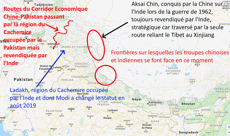 La Chine, dont je notais il y a quelques mois que le regain d'assertivité indienne au Cachemire l'avait rendue nerveuse, car il menace le précieux corridor économique Chine-Pakistan, qui doit lui garantir un accès aux hydrocarbures du Moyen-Orient via le port de Gwadar, évitant les détroits contrôlés par les Américains (Malacca) et les eaux sous surveillance indienne (Océan Indien) est donc en train de réagir en tentant de prendre des positions stratégiques en territoire indien. 5000 à 1000 soldats chinois se seraient déjà massés, en quelques jours, sur la frontière du Ladakh et de l'Uttarakhand. Une réédition de la confrontation du Doklam est en train de se produire, que des commentateurs estiment déjà plus dangereuse encore, en raison de l'intérêt du Pakistan pour la même région. On parle des incidents de frontière les plus graves depuis le conflit de Kargil avec le Pakistan en 1999.